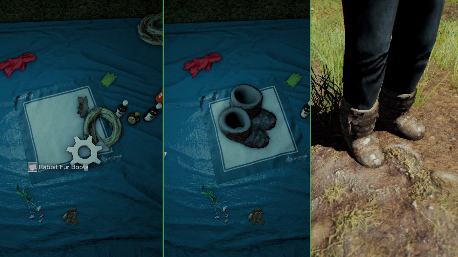 Rabbit Fur Boots Wear on feet to gain some protection from cold and slightly increased stealth. 3 Rabbit Skins + 2 Rope